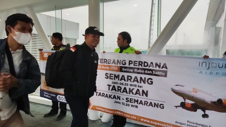 SEMARANG (jatengtoday.com) – Bandara Jenderal Ahmad Yani Semarang resmi melayani rute penerbangan baru Semarang (SRG)–Tarakan (TRK) yang dioperasikan oleh maskapai Super Air Jet, yang terbang perdana pada Sabtu (22/03/2025).