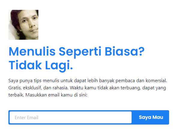 Social Proof. Bukti bahwa secara sosial kamu diterima secara luas. Paling ampuh, kalau kamu dapat testimonial dari beberapa subscriber yang punya pengaruh secara sosial. Pasang foto asli dan sebaris informasi tentang “siapa” mereka, dan sekalimat dari mereka.